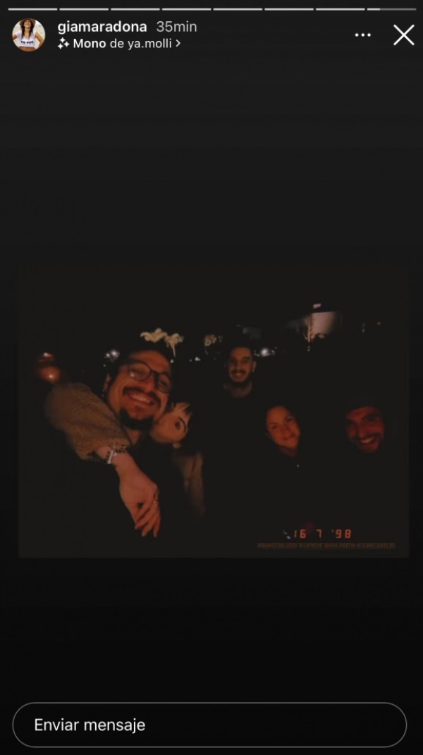 Es esta oportunidad, la hija de Diego Maradona recurrió a Instagram Stories para plasmar una postal con el exfutbolista y ex de Jimena Barón, con quien tiene a su hijo Momo, a puro mimo mientras le da un beso en el cachete y posa para la cámara junto a otras personas.