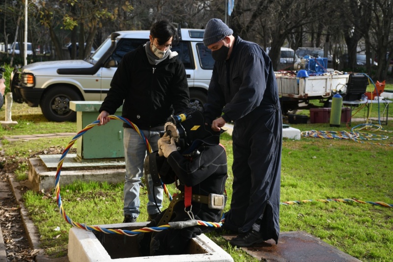 Durante la jornada de hoy, un buzo especializado inspeccionó las válvulas de pie ingresando a la cisterna de 10.000 metros cúbicos emplazada en el Parque San Martín, que forma parte de la red de agua del sector sur de la ciudad de La Plata.