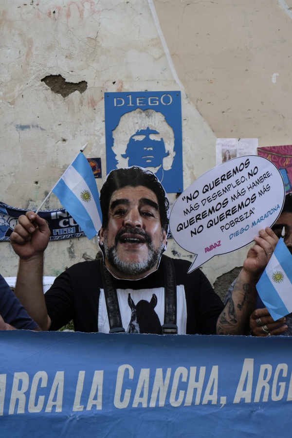 Activistas de Avaaz, una organización que promueve la participación ciudadana en asuntos como el cambio climático, entre otros, se manifestaron en Nápoles, Italia, con máscaras de Diego Maradona para que las naciones "más ricas del planeta paguen su deuda ecológica" y financien acciones para prevenir "más catástrofes climáticas".