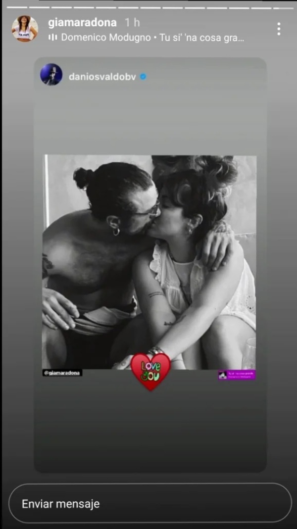 Y en esta oportunidad, tanto la hija de Diego Maradona como el exfutbolista (y ex de Jimena Barón, con quien tiene a su hijo Momo) optaron por plasmar en Instagram Stories la misma foto en blanco y negro dándose un romántico beso.