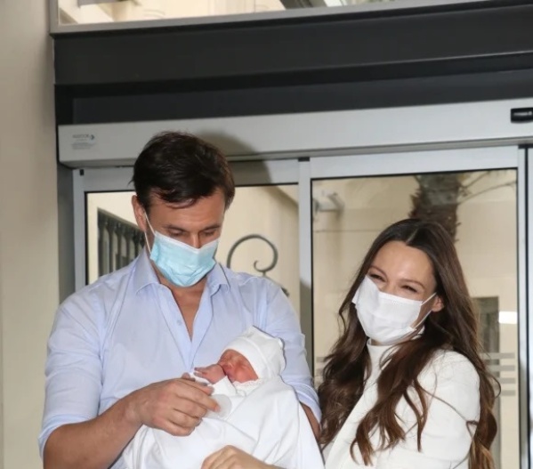 Su maquilladora, Estefanía Novillo, llegó un rato antes para retocar a la flamante madre y luego, la feliz pareja salió sonriente con la nueva integrante de la familia en brazos.