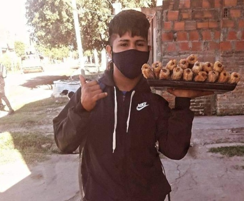 El joven, como se aprecia en la foto, sale todas las mañanas de manera ininterrumpida, desde muy temprano, para vender todos los churros y poder llevar un plato de comida a su casa.