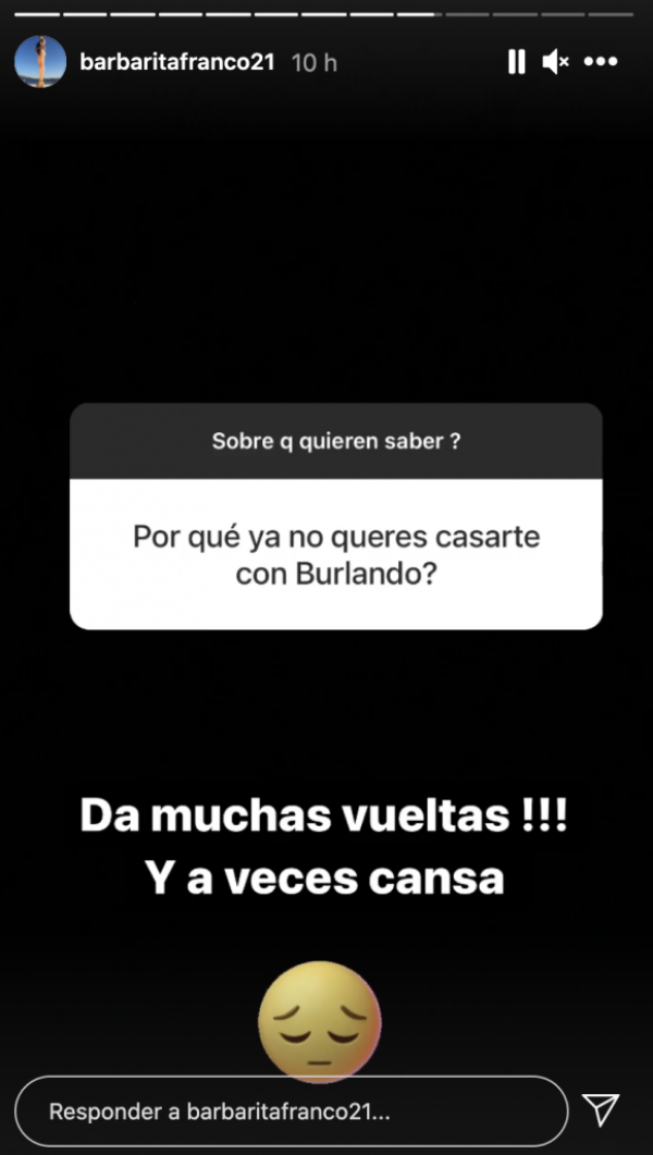 "¿Por qué ya no querés casarte con Burlando?", quiso saber un seguidor y ella fue sincera: "¡Da muchas vueltas! Y a veces cansa...".