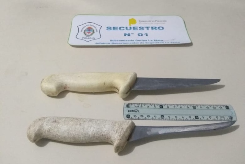 Según lo informado, el aprehendido fue trasladado al Destacamento Gorina y se le secuestró una navaja y dos cuchillas tipo carnicero. Interviene en la causa la UFI N? 5 del Departamento Judicial de La Plata.