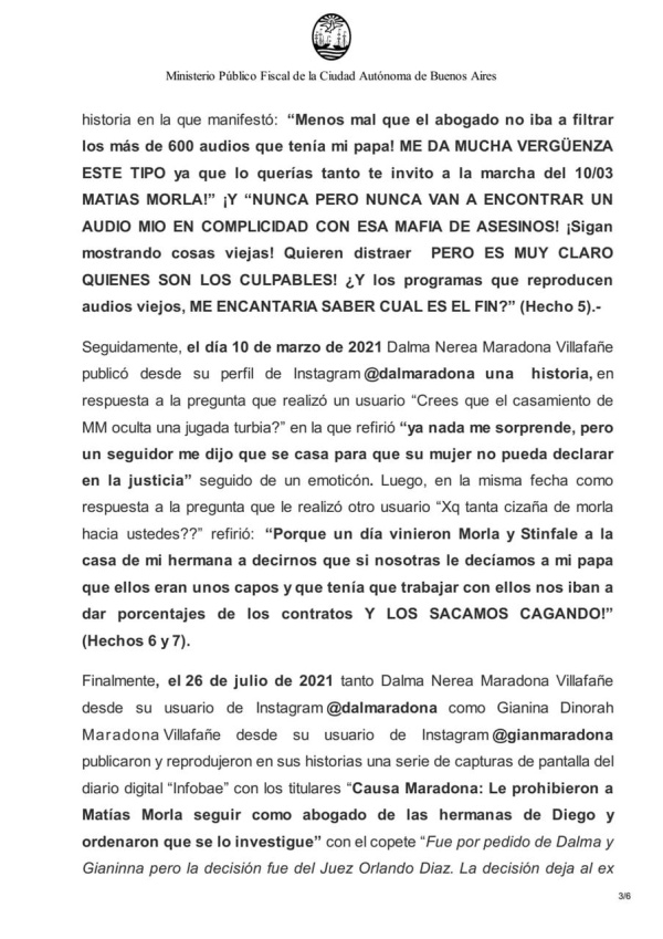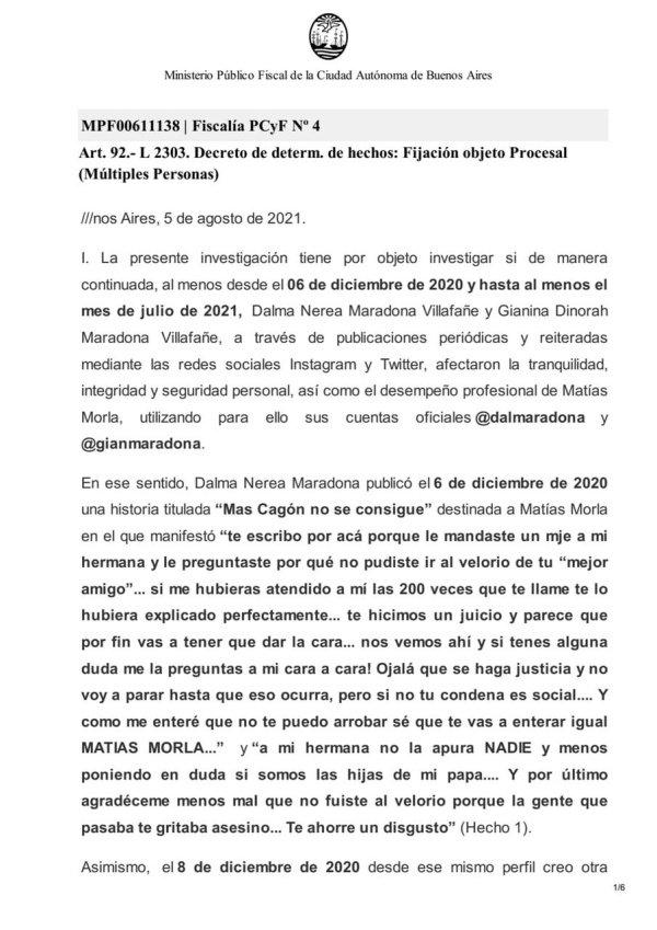 La resolución explica: "La presente investigación tiene por objeto investigar si de manera continuada, al menos desde el 06 de diciembre de 2020 y hasta al menos el mes de julio de 2021, Dalma Nerea Maradona Villafañe y Gianinna Dinorah Maradona Villafañe, a través de publicaciones periódicas y reiteradas mediante las redes sociales Instagram y Twitter, afectaron la tranquilidad, integridad y seguridad personal, así como el desempeño profesional de Matías Morla, utilizando para ello sus cuentas oficiales @dalmaradona y @gianmaradona".