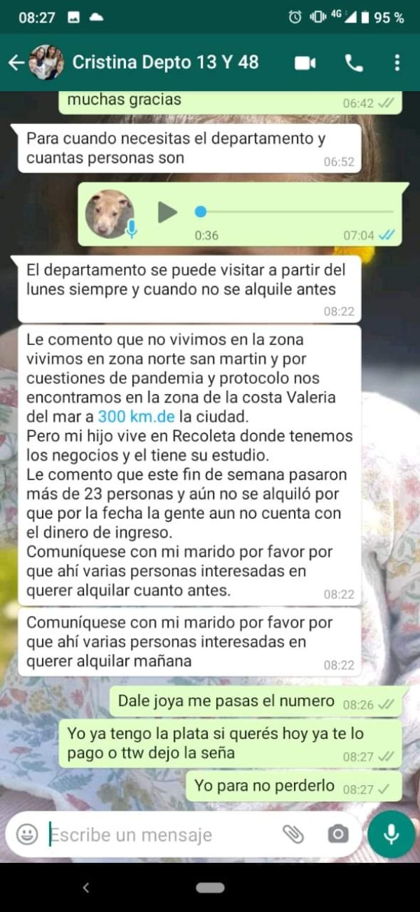 En uno de los mensajes que le envió la mujer, le comentó que residen en la zona de San Martin, pero que "por una cuestión de pandemia y protocolo nos encontramos en la zona de la costa en Valeria del Mar".