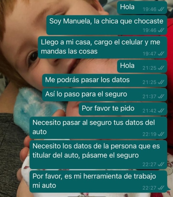 “Le digo que por favor parara y me diera sus datos. Finalmente se bajó, me dijo que no tenía documentación y que lo iba a arreglar su marido. Me dio su celular y su dirección”, recuerda la joven.