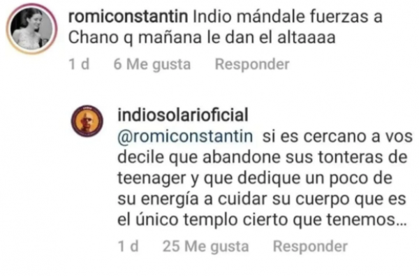Una seguidora de ambos músicos en Twitter, le escribió al líder de Los Redonditos de Ricota y le pidió que le mande fuerzas a Chano. Sorpresivamente el Indio le contestó y le mandó un contundente mensaje de aliento: “Si es cercano a vos, decile que abandone sus tonteras de teenager y que dedique un poco de energía a cuidar su cuerpo que es el único templo cierto que tenemos”.