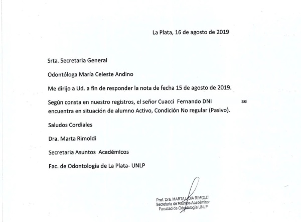 "Nosotros pedimos a la Facultad de Odontología de la Universidad de La Plata que nos otorgara un parte sobre su situación. Nos afirmaron que era un estudiante que había cursado algunas materias, pero que su situación actual era pasiva. Nos aseguraron que el analítico sobre su historial solo será entregado a la Justicia", afirmó la presidenta del Colegio.
