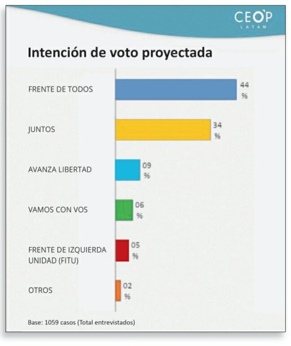 Cuando se pregunta directamente por el voto, el FdT obtiene el 38,4 por ciento y Juntos el 30,2. Son más de ocho puntos de diferencia. Pero la proyección de los nueve puntos de indecisos, le permite al CEOP diagnosticar 43,7 por ciento a 34,4, algo más de nueve puntos de ventaja.