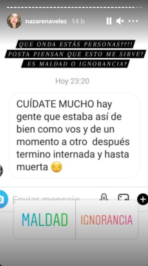 Hace un día Nazarena Vélez compartió con sus seguidores que había dado positivo de Covid-19. La actriz transita la enfermedad con leves dolores de cabeza y corporales, pero sin perder el humor. A través de sus stories se molestó por un mensaje en especial que recibió