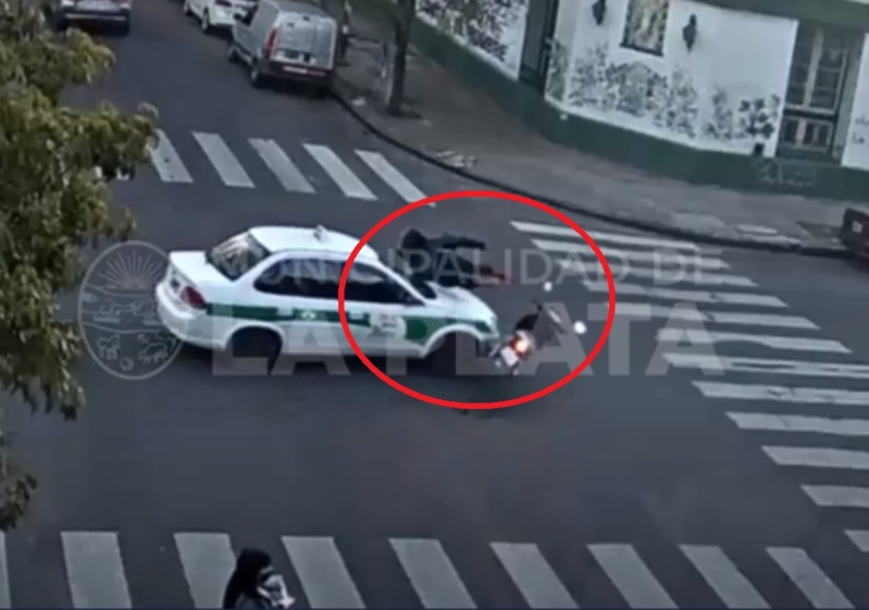 En la intersección de las calles 11 y 46, un motociclista chocó con un taxi, rodó por el capot y cayó al asfalto. El siniestro quedó registrado en las cámaras de seguridad de la Municipalidad de La Plata.