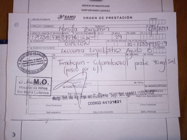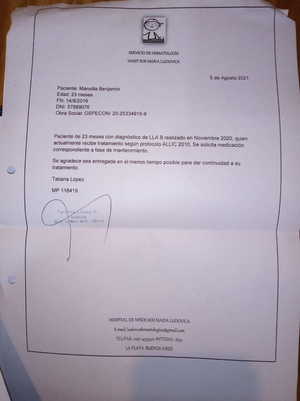 “La obra social nos dijo que no se hacía cargo porque la enfermedad era preexistente, pero luego nos explicaron que sí debían hacerlo. Tenemos hasta la receta, y la medicación oncológica es carísima. Está con Evermin Metotrexato 10mg, Marcaptopurina 50mg. Incluso tuve que ir a buscar cuatro cajas que nos donaron, porque la gente se mueve más que la misma obra social”, dijo.