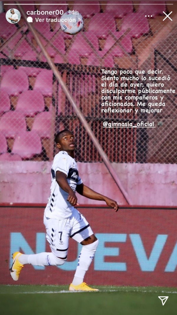 Según le confirmaron a LAPLATA1.com en la vuelta a los trabajos y en las diferentes charlas que habitualmente se realizan Carbonero asumió su error ante sus compañeros y en las últimas horas a través de las redes sociales se disculpó con los hinchas albiazules. En una de sus historias en su cuenta de instagram publicó "Tengo poco que decir. Siento mucho lo que sucedió el dia de ayer, quiero disculparme públicamente con mis compañeros y aficionados. Me queda reflexionar y mejorar."