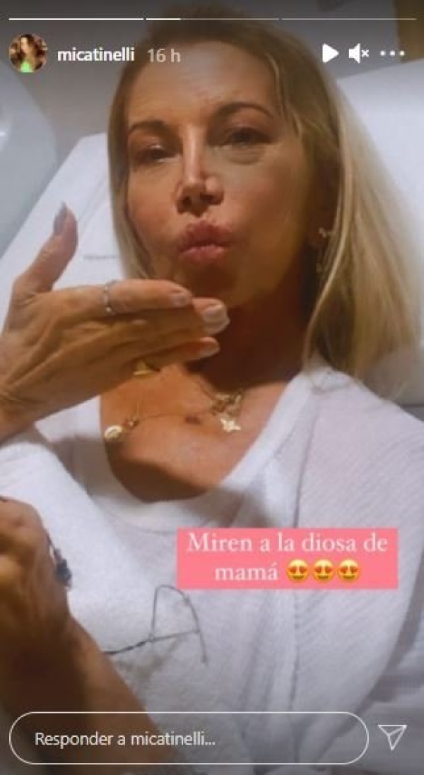 Mica Tinelli compartió una historia en su Instagram donde se ve a su mamá luciendo diferentes cadenas y anillos, mientras manda un beso a la cámara. “Miren a la diosa de mamá”, publicó junto con emojis con corazones en los ojos.