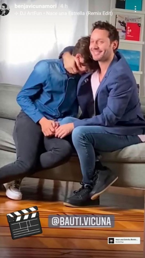 El actor muy emocionado, subió varias fotos a sus historias de Instagram donde mostró el detrás de escena de la grabación. Allí se pueden ver a padre e hijo vestidos de forma muy similar, ambos con camisa de jean, zapatillas y pantalones azules.