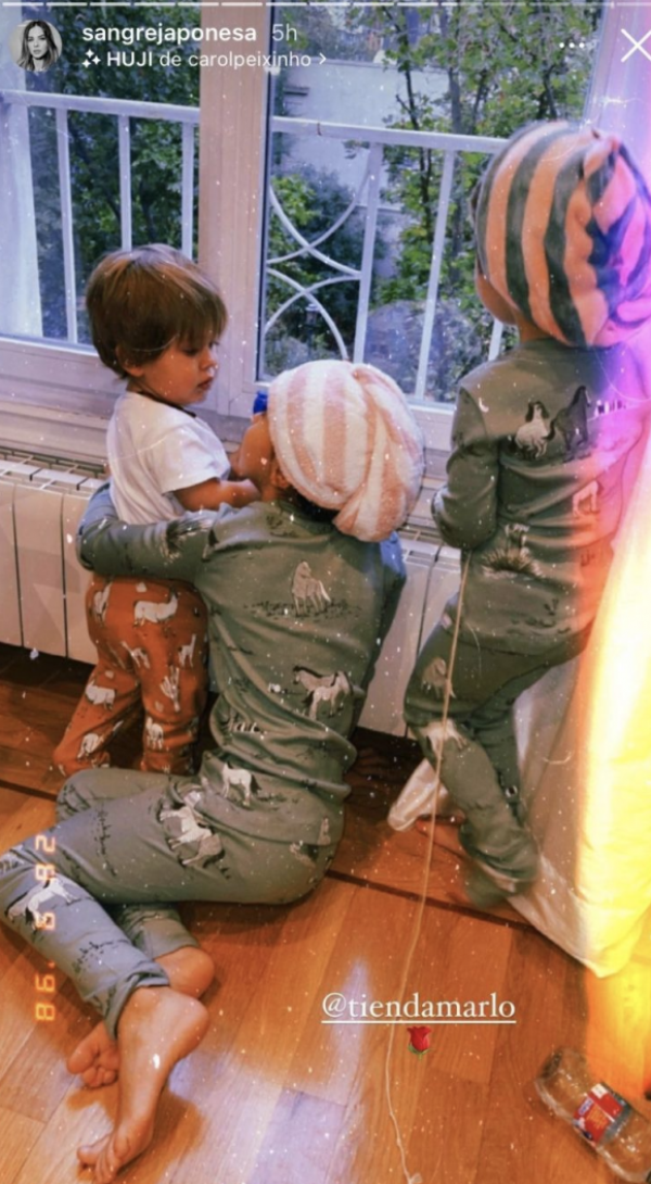 Allí se pueden ver a los tres hermanos mirando juntos por la ventana y luciendo el mismo pijama. Las nenas llevan puesto un conjunto gris con animalitos, mientras que Amancio, el menor de los tres, lleva el mismo pantalón en tonos tierra.
