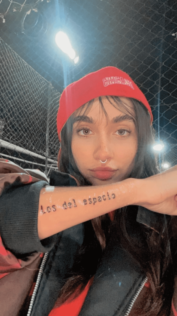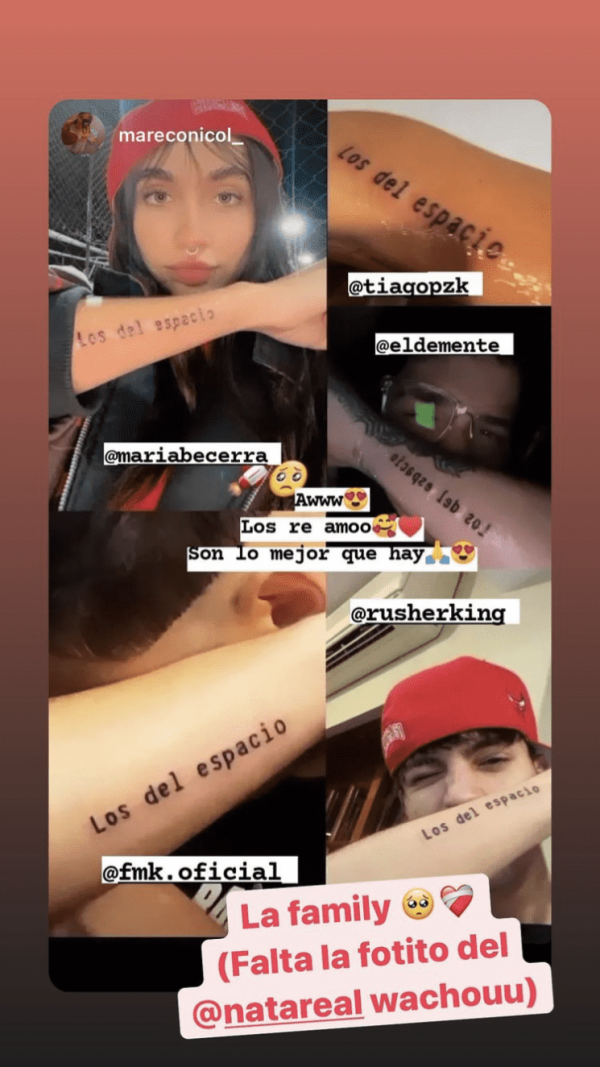 La cantante mostro que se tatuó la frase “Los del espacio” en letras negras, a lo largo de su antebrazo. Además de Rusherking, también se inmortalizaron la frase el cantante Tiago PZK, el artista FMK y el youtuber El Demente. Todos ellos forman parte del grupo "Los del espacio" y por eso decidieron llevarlo en la piel.