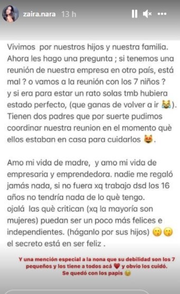 Dado que muchos seguidores las criticaron por haber dejado a sus hijos en casa, Zaira, cansada de que las critiquen a ellas y no a los padres cuando viajan por trabajo, hizo un gran descargo: "Vivimos por nuestros hijos y nuestra familia, ahora les hago una pregunta... Si tenemos una reunión de nuestra empresa en otro país, ¿está mal? ¿O vamos a la reunión con los 7 niños? Y si hubiera sido para estar un rato sola, también habría estado perfecto... Qué ganas de volver a ir”, escribió irónica.