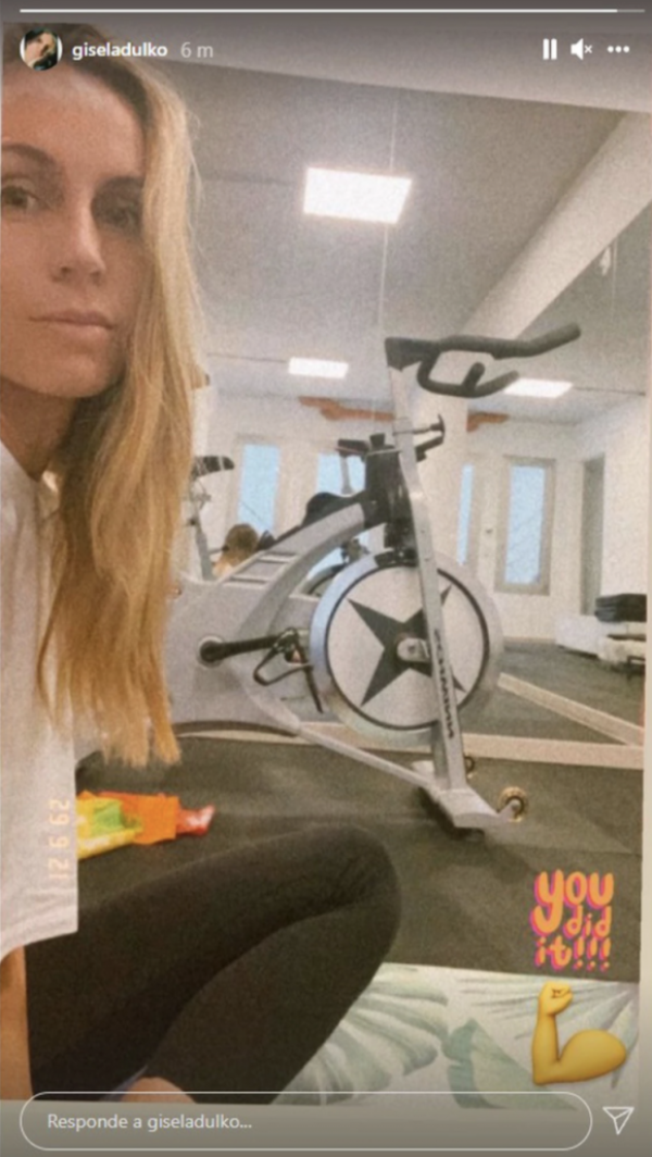En medio de la crisis, reapareció en las redes sociales y se mostró entrenando en el gimnasio. Allí se la ve con unas calzas negras y una remera blanca, sentada en un mat estampado al lado de una bicicleta fija.