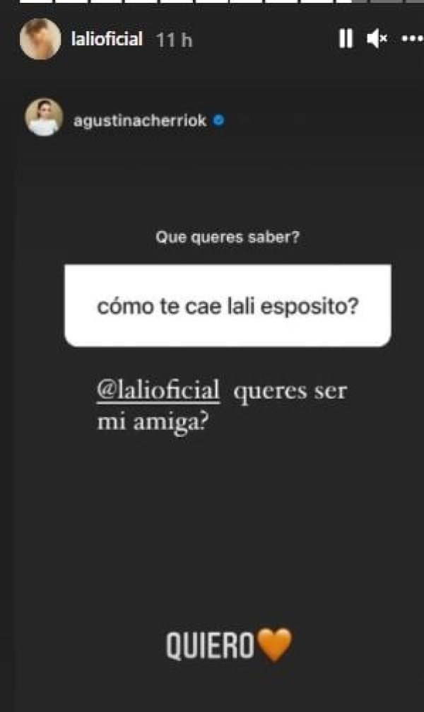 En seguida, Agustina Cherry, compartió su respuesta y etiquetó a la cantante. “¿Querés ser mi amiga?”, escribió la actriz de una manera muy tierna. Por su parte, Lali le contesto “Quiero”, junto a un emoji de un corazón naranja, demostrándole todo su amor.