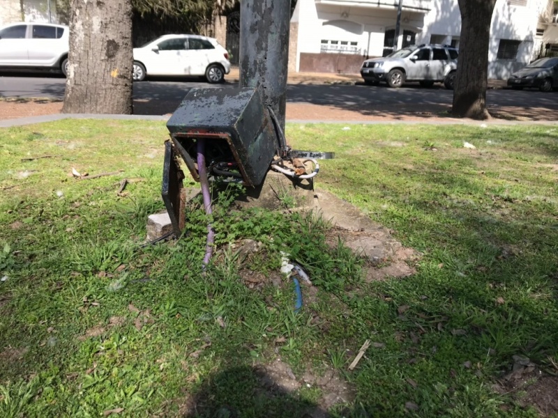 Los vecinos de la Plaza Alsina están preocupados porque hay un poste de luz, que debajo tiene todos los cables expuestos. Esto se encuentra en plena plaza, ubicada en calle 1 y diagonal 74, y se encuentra al alcance de cualquier peatón.