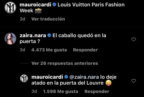 Zaira Nara y Neymar se encargaron de dejar comentarios picantes en la foto que Mauro Icardi compartió junto a Wanda en el Louis Vuitton Paris Fashion Week. Desde su cuenta oficial de Instagram, el futbolista publicó una imagen en la que se puede ver el look gauchesco que eligió para el evento de moda y su cuñado y su amigo lo gastaron.