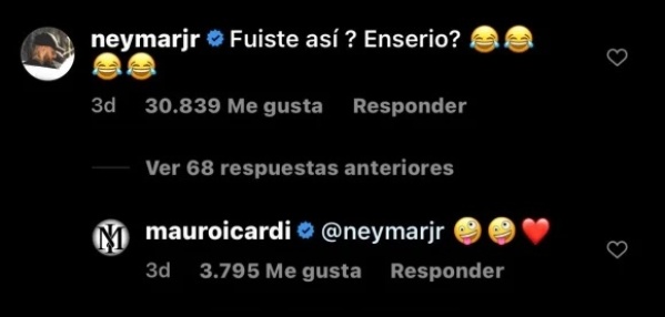 Pero las críticas con humor de sus allegados no terminaron allí ya que Neymar también quedó sorprendido por el atuendo que escogió para el desfile de la reconocida marca. “¿Fuiste así? ¿En serio?”, expresó sin filtros su compañero del Paris Saint Germain y le contestó con corazones y caritas cómicas.