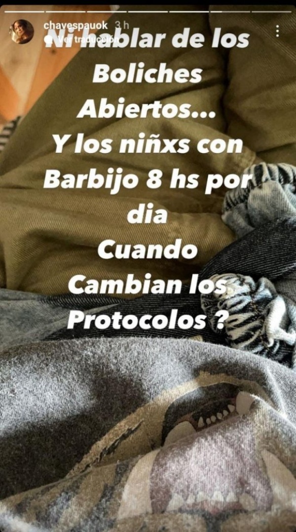 Además, aprovechó para dar su opinión sobre las flexibilizaciones que anunciaron en las últimas semanas. "Ni hablar de los boliches abiertos y de los niños con barbijo durante ocho horas por día... ¿Cuándo cambian los protocolos?", preguntó de manera irónica.