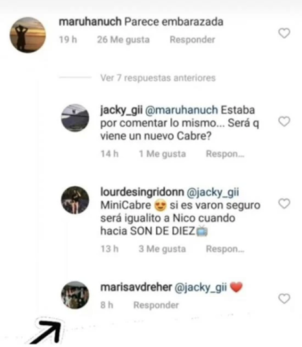 Pero sus seguidores, hicieron una observación particular: “Parece embarazada” comentó una usuaria, y desató una catarata de comentarios que abalaban dicho aspecto. Pero lo que llamó la atención, fue que la prima de Cabré respondió uno de los mensajes donde se decía que Laurita estaba embarazada con el emoji de un corazón rojo.