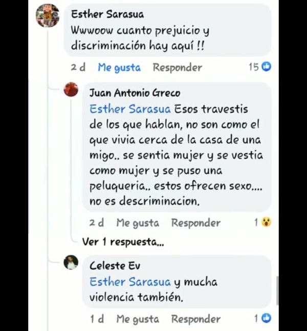 "Qué espanto, discriminatorio y decadente", dijo una mujer ante aquella publicación. Otros, queriendo generar un pésimo clima, peor del que ya había, se reían de la situación. Diego, un hombre que lucha día a día por las diversidades sexuales, pidió que tengan un poco más de respeto, pero algunos comenzaron a agredirlo.