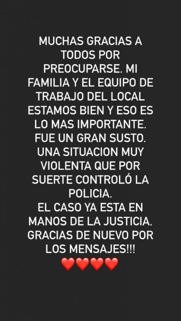 “Muchas gracias a todos por preocuparse. Mi familia y el equipo de trabajo del local estamos bien y eso es lo más importante. Fue un gran susto”, expresó relatando lo sucedido.