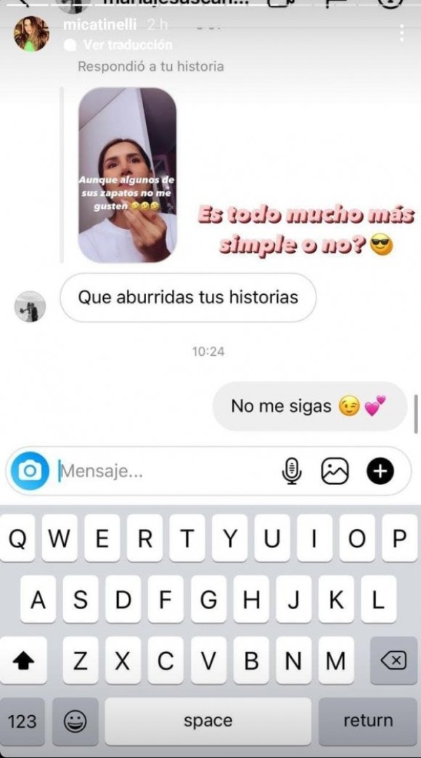 La seguidora de Mica, le respondió la historia donde ella hablaba de los zapatos y le escribió: “¡Qué aburridas tus historias!”. Sin dudarlo, la dueña de “Ginebra” le respondió “No me sigas” junto a un emoji que guiña el ojo y dos corazones, de forma irónica.