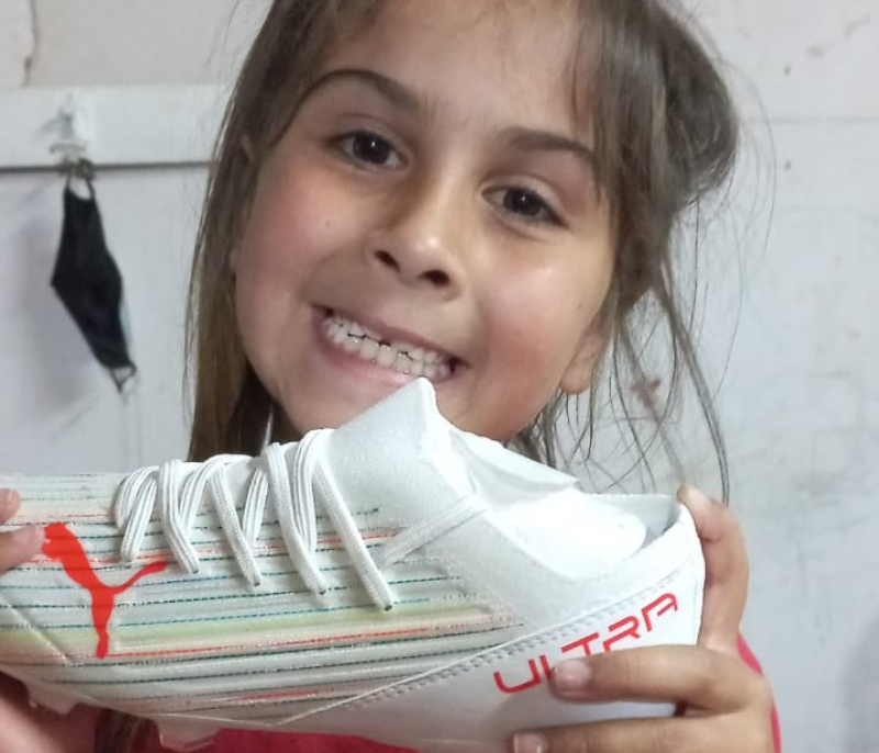 Clara juega al fútbol desde los cuatro años. Va a cumplir ocho el próximo 7 de noviembre, y como regalo adelantado de cumpleaños, su mamá le compró un hermoso par (foto). Los tiene desde el 17 de octubre, y su mamá, Caterina, los compró con mucho esfuerzo.