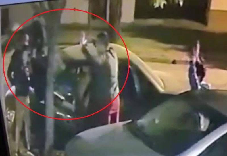 Sólo había pasado media hora, cuando en 64 entre 29 y 30, a la vuelta de donde había ocurrido ese hecho, una familia fue asaltada cuando bajaba de un auto. Todo quedó registrado en las cámaras de seguridad, donde se ve cómo dos delincuentes a bordo de una moto los abordan e incluso le quitan algo de la mano a un chiquito que se encontraba presente.