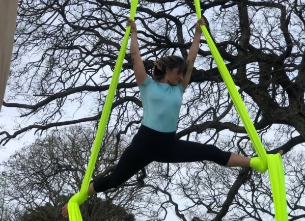 Todos los lunes, miércoles y viernes hace acrobacias con tela en Parque Castelli junto a adultos. Los sábados da clases para chicos y chicas.