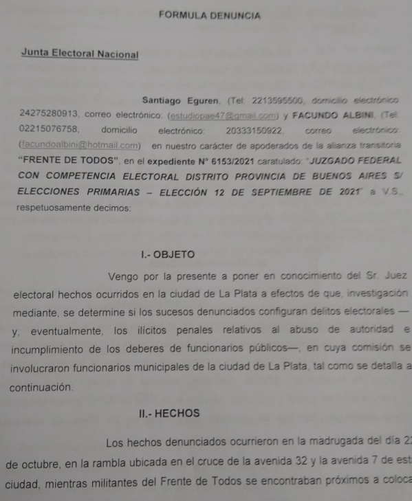 Los apoderados del Frente de Todos de La Plata, Facundo Albini y Santiago Eguren, presentaron una denuncia ante la justicia por el secuestro de los carteles en 7 y 32 ocurridos en el mes de octubre.
