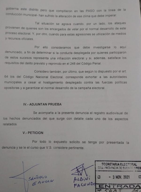 En ese sentido, la denuncia pide “exhortar a las autoridades municipales a cesar el hostigamiento desplegado contra las fuerzas políticas opositoras y garantizar el normal desarrollo de la campaña electoral”.