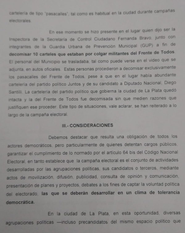 “La cartelería del partido político que gobierna la ciudad de La Plata quedó intacta y la del Frente de Tofos fue decomisada sin que medien razones que justifiquen ese proceder”, agregaron.