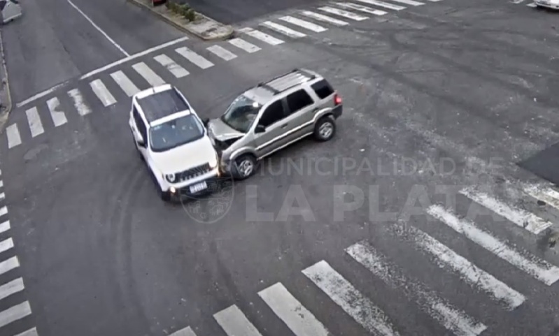 Una camioneta Jeep de color blanca, que circulaba por Av. 7, intentó cruzar el semáforo de la esquina de calle 54 en rojo e impactó fuertemente contra una Eco Sport que avanzaba con el semáforo en verde: dieron un par de trompos pero por suerte ninguno volcó.