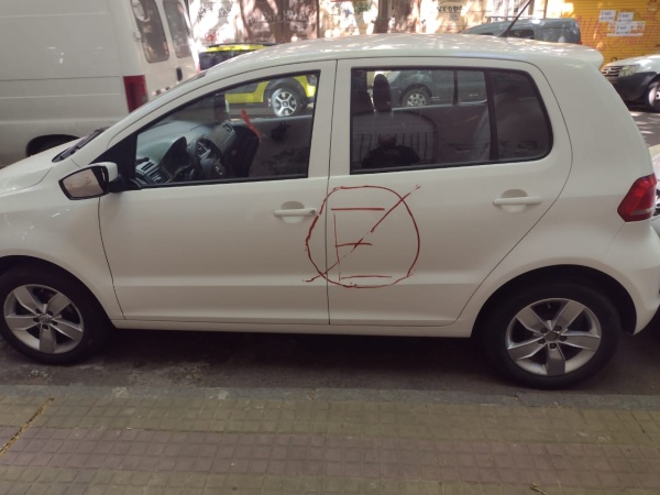 Si bien no se sabe qué tipo de material utilizó para pintarlo, la persona le realizó un escrache con el símbolo de prohibido estacionar tanto en la parte delantera del auto como en la lateral.