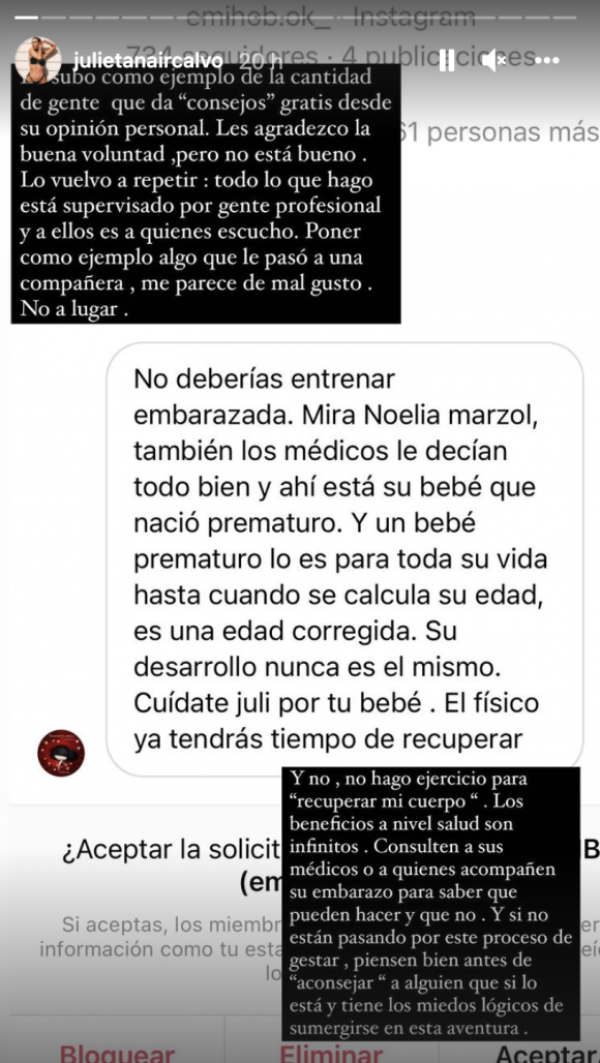 Sin embargo, en medio de la alegría, la actriz recibió duras críticas por parte de sus seguidores por entrenar durante su embarazo. “No deberías entrenar embarazada. Mirá a Noelia Marzol, los médicos le decían que todo bien y su bebé nació prematuro. Y un bebe prematuro lo es para toda la vida, hasta cuando se calcula su edad, es una edad corregida. Su desarrollo nunca es el mismo”, le escribió una seguidora en un mensaje privado.