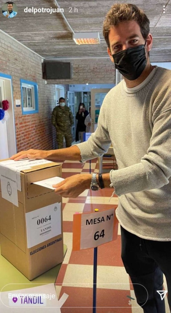 A través de sus historias de Instagram, la promesa del tenis, retrató el momento exacto en que vota en la escuela que le asignaron en Tandil, su ciudad natal. Con un look descontracturado y relajado, Del Potro, sonrío para la cámara con el barbijo puesto y compartió el momento con todos sus seguidores.