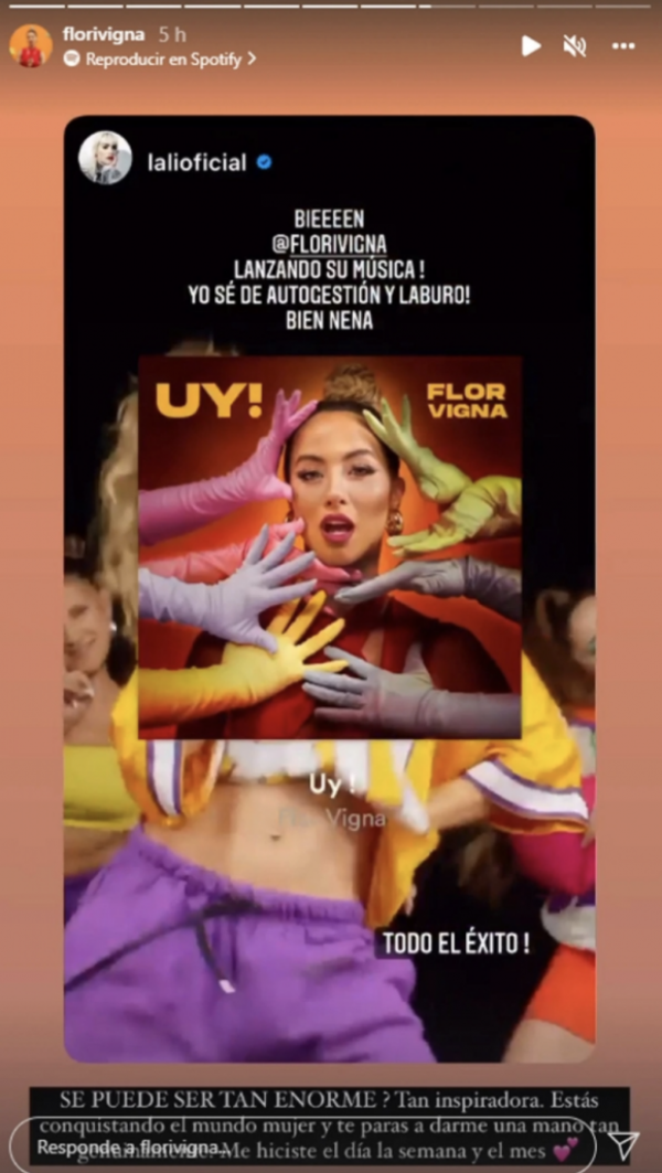 A pesar de haber recibido algunas críticas por su extravagante videoclip, Flor Vigna también recibió varios mensajes de apoyo. Entre ellos, recibió unas cálidas palabras de Lali Espóstio, quien compartió la portada de la canción en sus historias de Instagram.