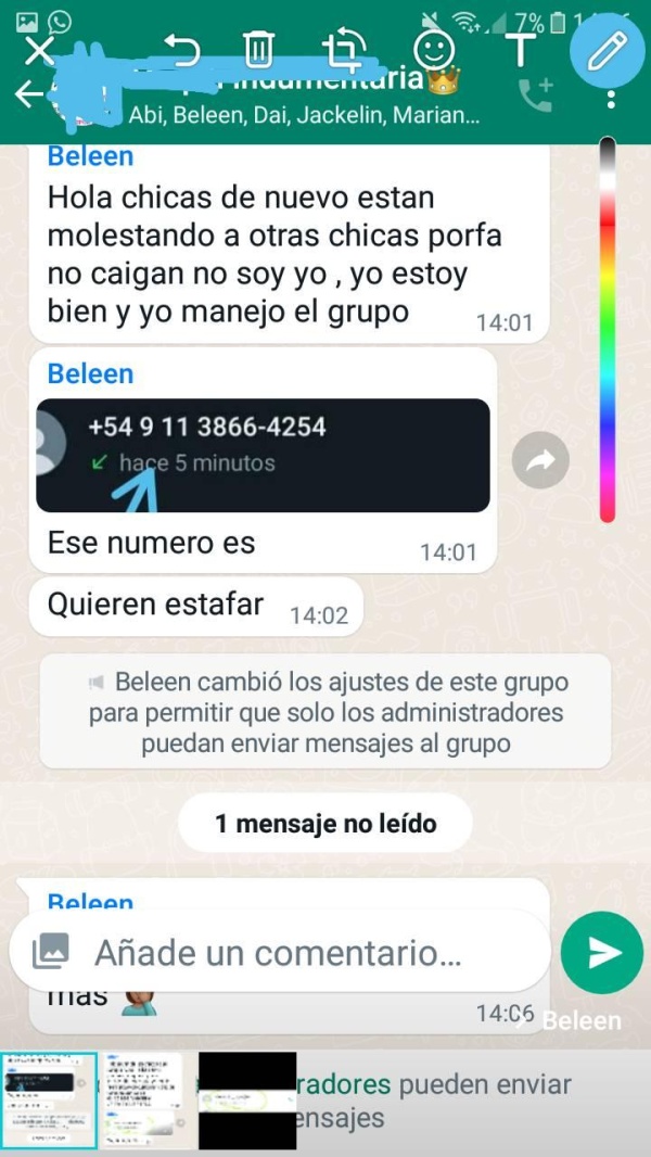 "Están queriendo estafar gente. Compartan, dice que es el marido de ella, que está internada", comentó su cuñada, alertando lo sucedido. En las imágenes se ve un número de teléfono con la característica de Capital.