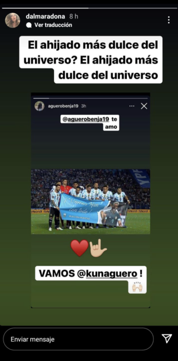 En medio del homenaje, su hijo Benjamín, fruto de su relación con Gianinna Maradona, compartió la imagen junto a un emoji de un corazón. Como respuesta a ello, Dalma su ex cuñada, replicó el mensaje de apoyo. "El ahijado más dulce de Universo, te amo. ¡Vamos, Kun!", comentó muy emocionada y alentando al jugador.