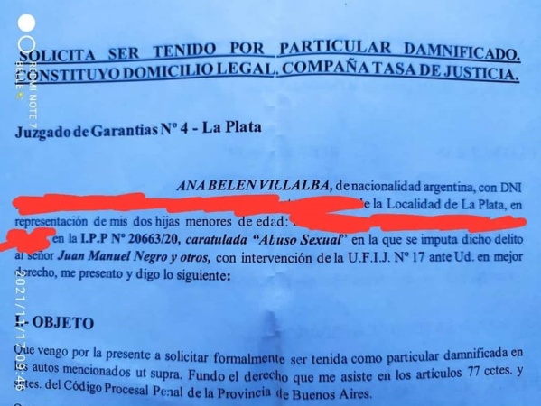 Hasta el que el 23 de junio, su hija de 12 años la llamó "llorando, diciendo que no aguantaba más. Me tenía que decir que J.M Negro abusaba de la hermana", dijo. En ese momento, decidió llamar a la policía. "Consulte cómo seguir y dónde ir y me dirigí a la DDI de La Plata, donde me tomaron la denuncia con el escaso relato que logré sacar de ambas nenas entre lágrimas".