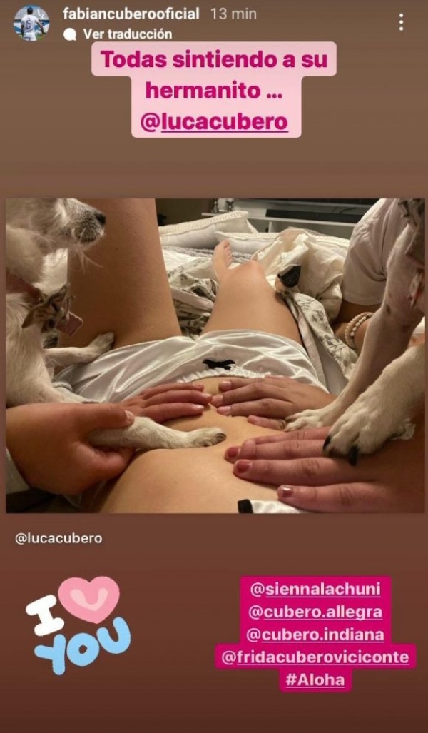Pero eso no es todo, ya que sus hijas caninas también apoyaron sus patitas sobre Luca para darle la bienvenida. "Todas sintiendo a su hermanito”, escribió muy feliz Cubero, compartiendo la cuenta de Instagram de su hijo por nacer.