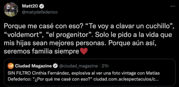 Es así que el futbolista, muy dolido hizo un descargo en su cuenta de Twitter. "¿Por qué me casé con eso? 'Te voy a clavar un cuchillo', 'Voldemort', 'El progenitor'", inició relatando todas las frases picantes que Cinthia le dedicó.