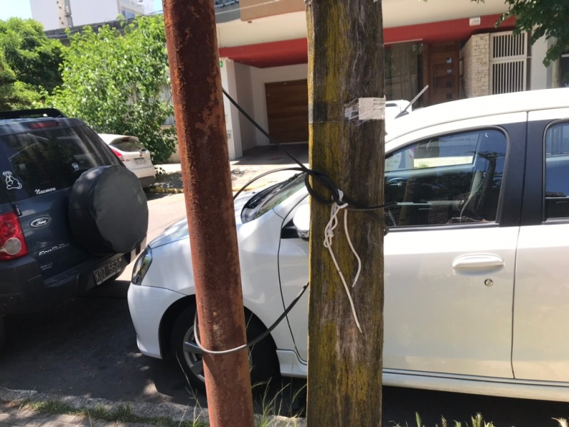 El hecho ocurre en 45 entre 16 y 17, donde un manojo de cables se “desprendieron del resto” y quedaron colgando sobre la vereda. Para evitar cualquier tipo de accidentes, los vecinos de la zona, decidieron atar los cables con un cordón a un poste de luz.